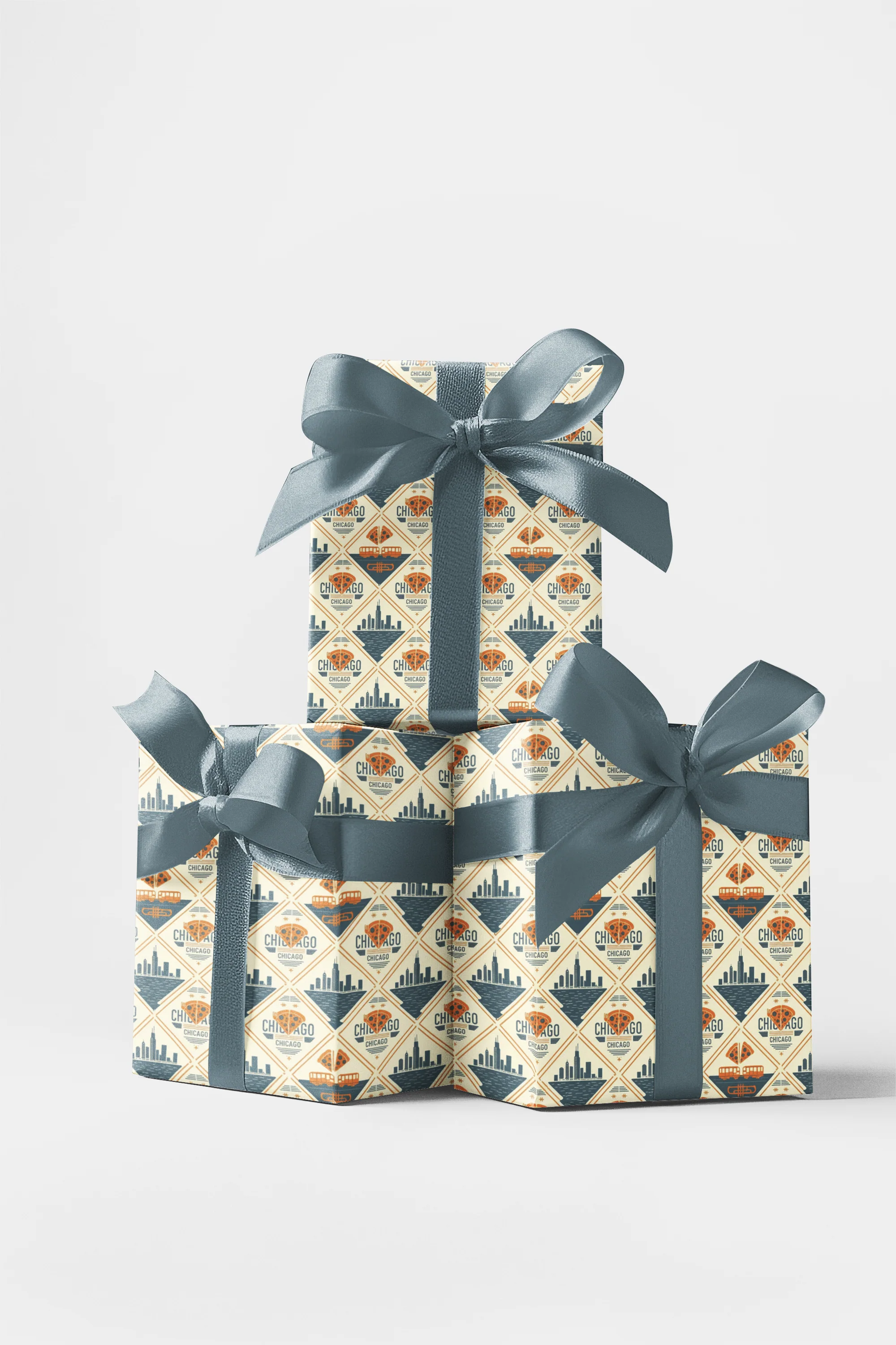 This wrapping paper design, titled "Chicago – Windy City Chic" is a sophisticated tribute to Chicago's iconic identity. The pattern features a meticulous diamond-grid layout that balances urban grit with high-end boutique style. Within the design, you'll find the legendary Chicago skyline rising over Lake Michigan, deep-dish pizza slices, and jazz-inspired trumpets, all rendered in a clean, mid-century modern aesthetic.