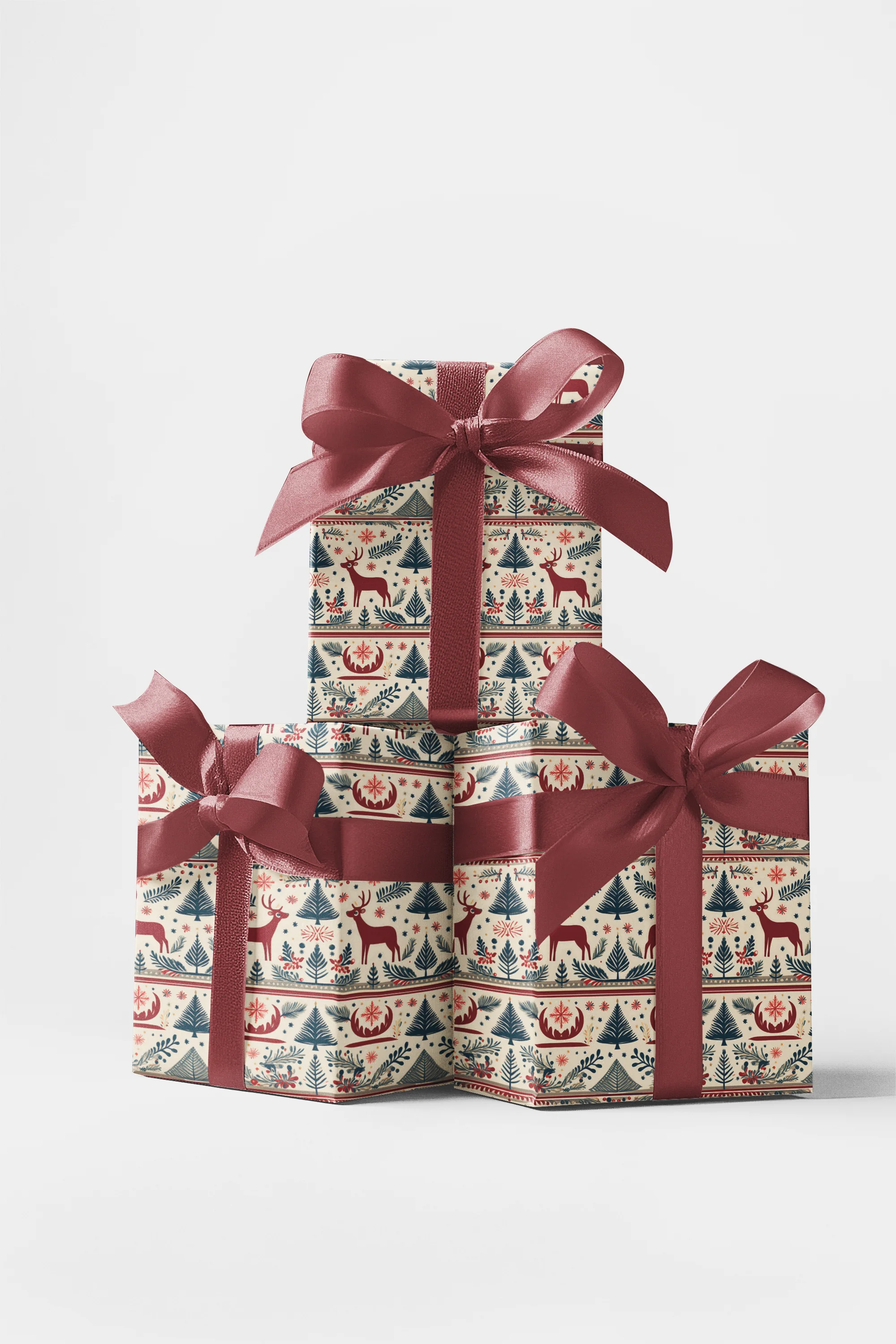 Bring Nordic warmth to your gifts with our Folk Antlers wrapping paper! This cozy design features rows of deer, fir trees, snowflakes, and folk-style florals in deep red, muted blue, and cream. Perfect for Christmas or winter celebrations, it adds a handcrafted, rustic charm to every present. Made from high-quality, durable paper for a timeless finish.