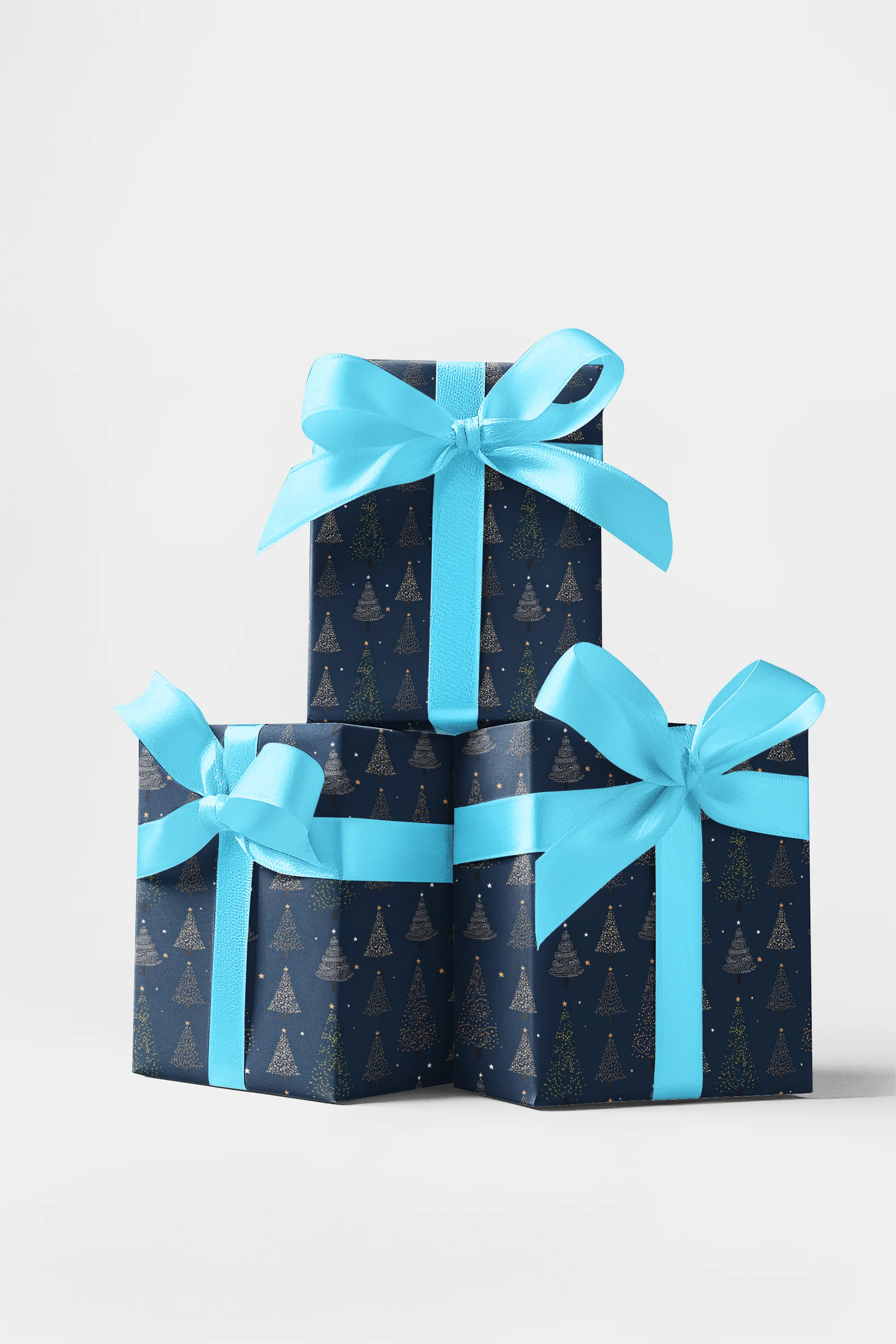Bring the twinkling magic of a winter wonderland to your gifts with our enchanting Night Christmas Trees wrapping paper. This elegant design features a constellation of beautifully decorated Christmas trees, each sparkling with delicate gold and silver lights, all set against a sophisticated deep navy blue background. Tiny stars dot the spaces between the trees, enhancing the magical, nighttime ambiance. Perfect for adding a touch of serene holiday charm and sophisticated sparkle to your presents, our premium wrapping paper is ideal for Christmas, New Year's, or any winter celebration.