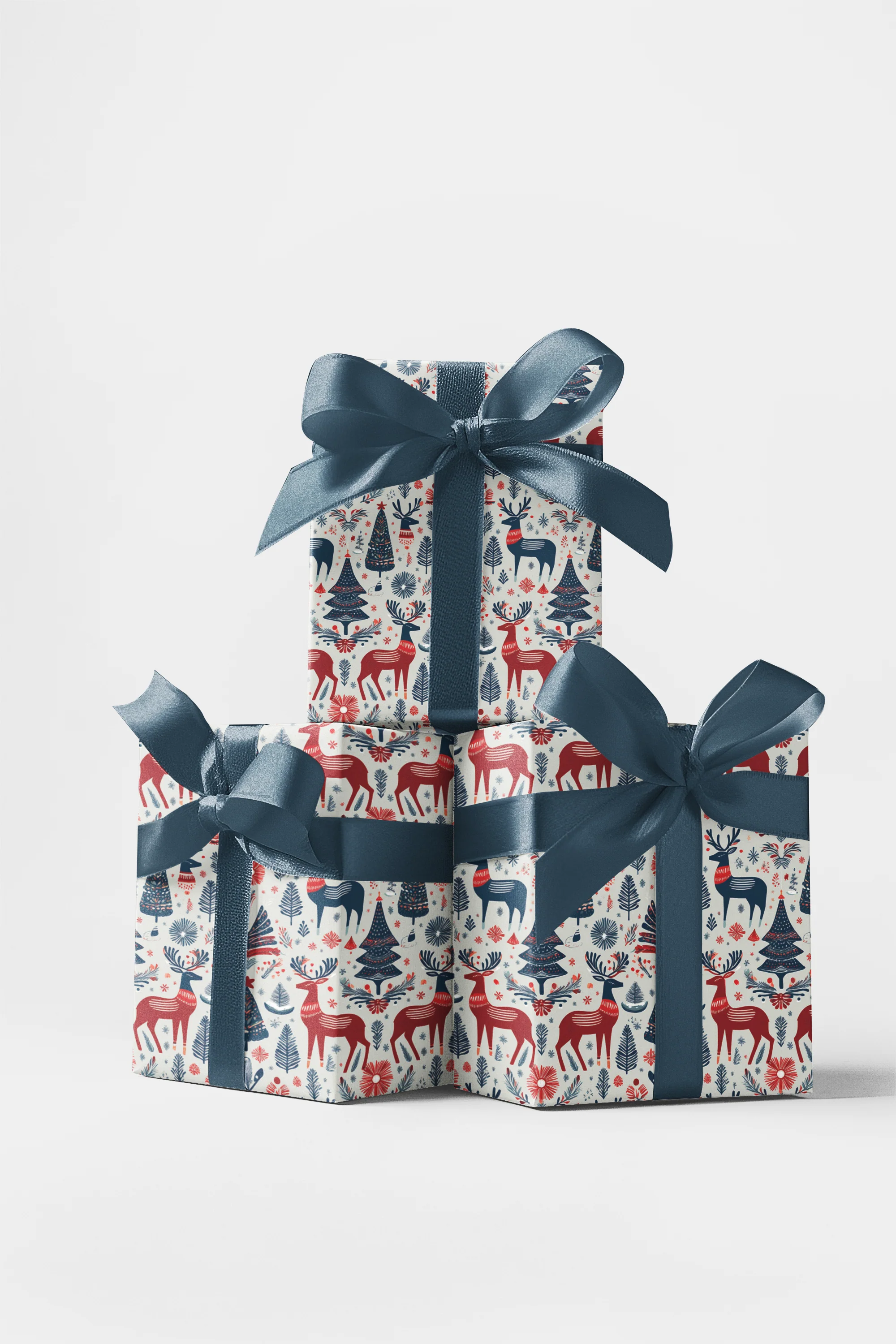 Celebrate the cozy charm of a Scandinavian winter with our Nordic Reindeer wrapping paper. This enchanting design showcases red and navy stags, festive trees, and floral accents in a folk-art style inspired by traditional Nordic textiles. Set against a soft, muted background, it captures the warmth and magic of a winter forest. Perfect for adding rustic elegance and handcrafted charm to your Christmas gifts and holiday celebrations.