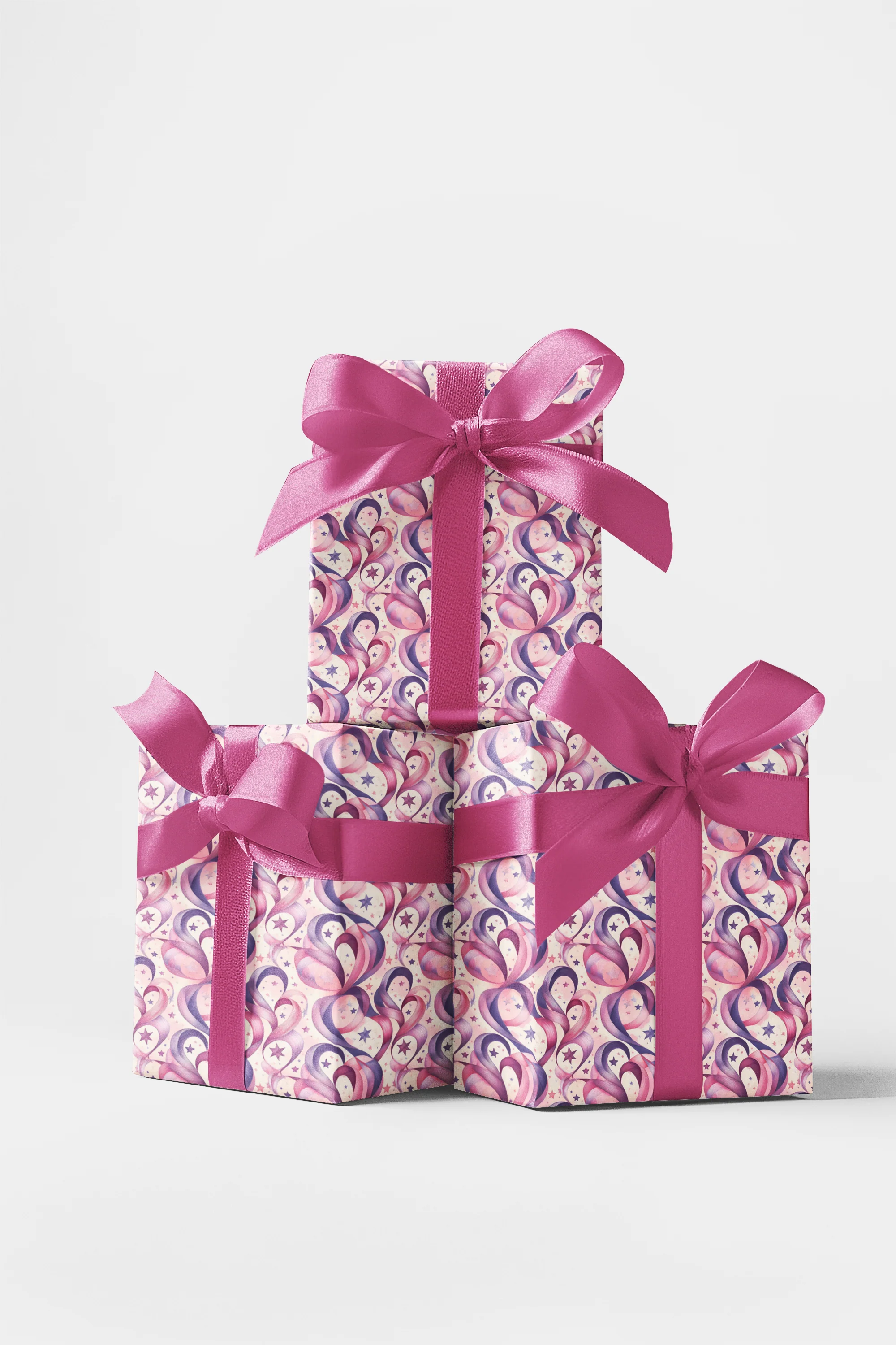Wrap your gifts with a touch of whimsy and charm using our Ribbon Reverie Wrapping Paper. Featuring flowing ribbons that twist into hearts, stars, and infinity shapes in soft pink-lilac gradients, this design exudes elegance and playfulness. Perfect for birthdays, anniversaries, and heartfelt occasions, it adds a romantic, dreamy finish to every beautifully wrapped gift.