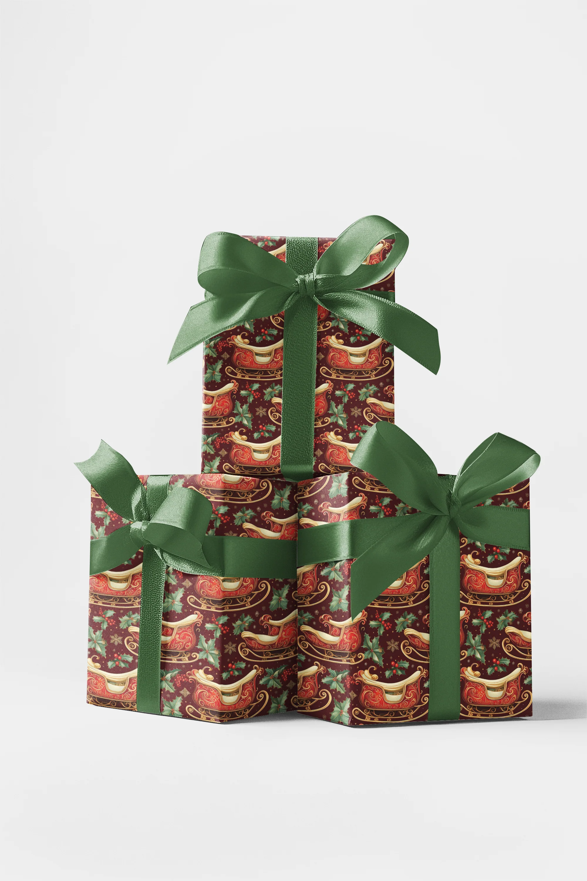 Bring timeless elegance to your holiday gifts with our Victorian Ride Wrapping Paper, an exclusive LondonPenny.com design inspired by the grandeur of a vintage Christmas. This luxurious pattern showcases richly detailed red and gold Santa’s sleighs in classic Victorian style, surrounded by holly leaves, red berries, and delicate snowflakes.